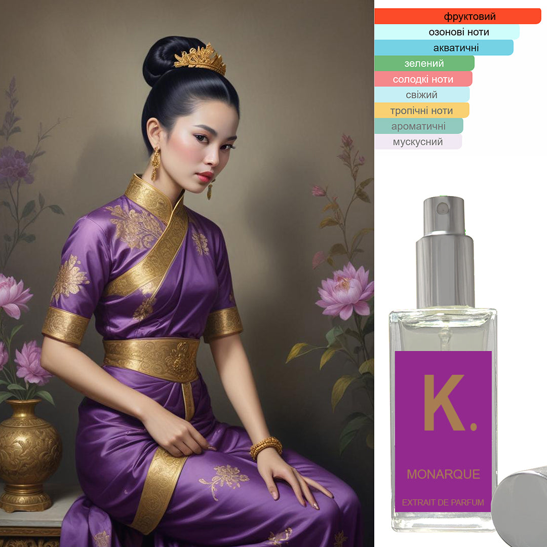" MONARQUE " - це квітковий парфум, який втілює суть жінки, яка рішуча, впевнена в собі та сповнена життєвої сили. Його свіжий і фруктовий аромат поєднується з квітковими нотами, що відображають її сильний характер та рішучість. Ідеальний для тих, хто знає, чого хоче, і не боїться це досягати.